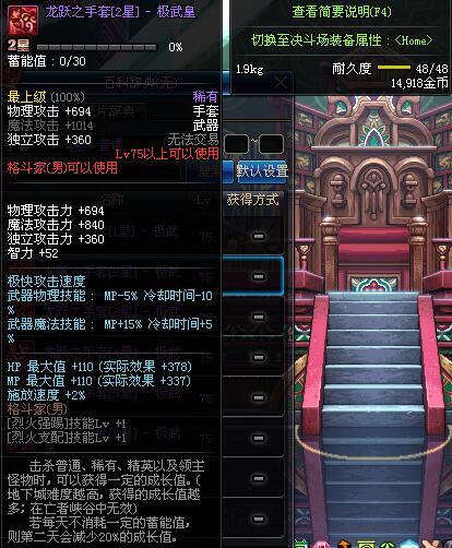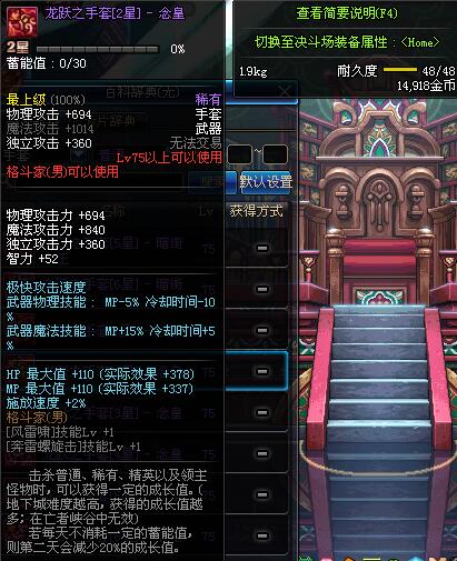 | 75 | 龙跃之手套[4星] - 极武皇 | *完成二次觉醒任务后可以从NPC小铁柱处获得此道具。 | ||