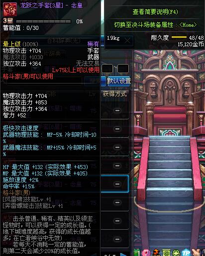 | 75 | 龙跃之手套[1星] - 念皇 | *完成二次觉醒任务后可以从NPC小铁柱处获得此道具。 | ||