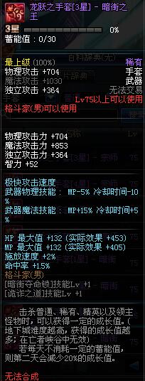| 75 | 龙跃之手套[4星] - 暗街之王 | *完成二次觉醒任务后可以从NPC小铁柱处获得此道具。 | ||