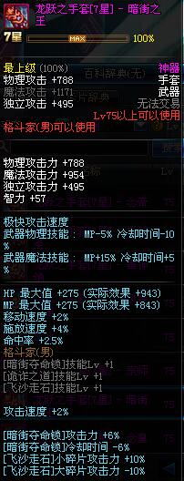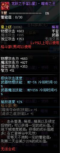 | 75 | 龙跃之手套[1星] - 暗街之王 | *完成二次觉醒任务后可以从NPC小铁柱处获得此道具。 | ||