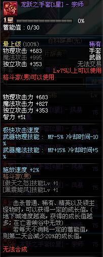 | 75 | 龙跃之手套[4星] - 宗师 | *完成二次觉醒任务后可以从NPC小铁柱处获得此道具。 | ||