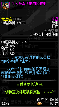 | 45 | 半人马军团的首领护甲 | *半人马 掉落(树精繁殖地) *伊莎杜拉 出售(阿拉德陨石×147) |