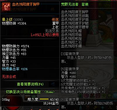 | 85 | 血色残阳獠牙胸甲 | *昨日之巴斯顿 掉落 (在远古地下城里出没。) *从NPC鲁特的物品店出售的[血色残阳防具礼盒]中获得 |