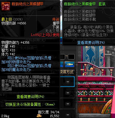 | 85 | 断肠绝伤之黑鳞腿甲 | *昨日之巴斯顿 掉落 (在远古地下城里出没。) *从NPC鲁特的物品店出售的[断肠绝伤防具礼盒]中获得 *任务奖励(地下城:比尔马克帝国试验场 NPC娜塔莉娅·休勒) |