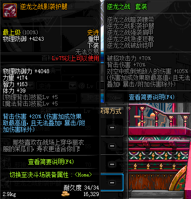 | 75 | 逆龙之战影袭护腿 | *Lv74~81深渊地下城怪物掉落 | 逆龙之战 套装 | |
