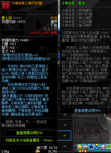 | 85 | 千蛛碎影之蛛网护腿 | *Lv84~91深渊地下城怪物掉落 | 千蛛碎影 套装 | |