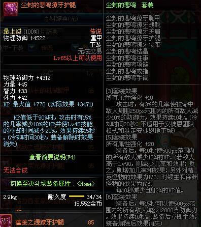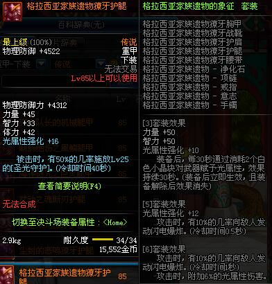 | 85 | 圣物 :荣耀的天马守护神的铂金护腿 | *Lv85~91普通地下城怪物掉落 | ||