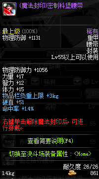 | 50 | 圣物 :荣耀的战争女神的墨钢腰带 | *Lv50~56普通地下城怪物掉落 |