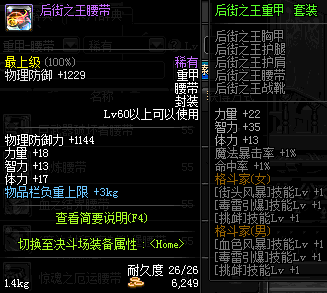 | 鬼剑士 | 神枪手 | 格斗家 | 魔法师 | 圣职者 | 暗夜使者 | 布甲 | 皮甲 | 重甲 | 轻甲 | 板甲 | 饰品 |