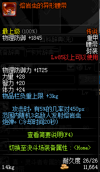 | 85 | 熔岩虫的异形腰带 | *熔岩怪虫 掉落(能量阻截战 10图) *设计图(能量阻截战 登场的NPC加百利 出售) |