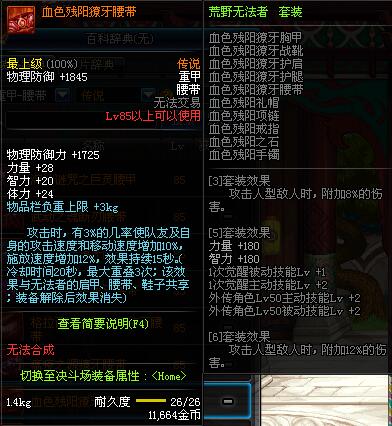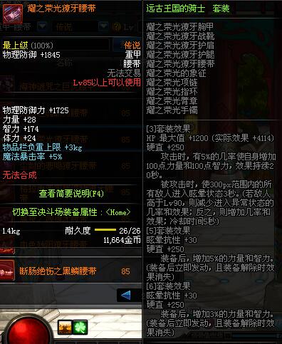 | 85 | 血色残阳獠牙腰带 | *昨日之巴斯顿 掉落 (在远古地下城里出没。) *从NPC鲁特的物品店出售的[血色残阳防具礼盒]中获得 |