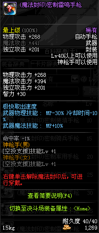 | 40 | (魔法封印)密制雷鸣手枪 | *Lv39~46普通地下城怪物掉落 *完成[变异的美神恩泽]任务 *使用Lv39~46怪物掉落的设计图进行制作 |