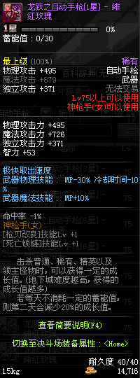 | 75 | 龙跃之自动手枪[1星] – 绯红玫瑰 | *完成二次觉醒任务后可以从NPC小铁柱处获得此道具。 | ||
