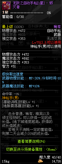 | 75 | 龙跃之自动手枪[4星] – 毁灭者 | *完成二次觉醒任务后可以从NPC小铁柱处获得此道具。 | ||