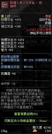 | 65 | 麦加的能量手枪 | *Lv64~71深渊地下城怪物掉落 *在NPC沉默之克雷娅的物品店购买 |