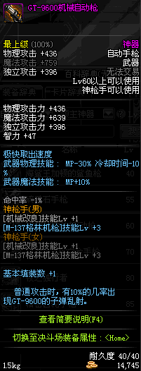 | 60 | GT-9600机械自动枪 | *GT-9600 掉落(地下城: 根特南门) **在NPC泽丁·施奈德的物品店购买(黑色陨石×375) |