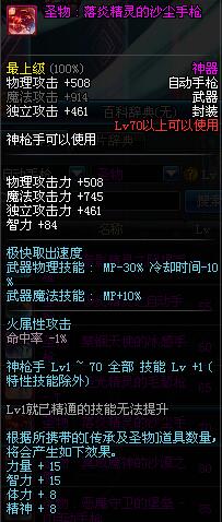 | 70 | 圣物 : 落炎精灵的沙尘手枪 | *Lv70~76普通地下城怪物掉落 |