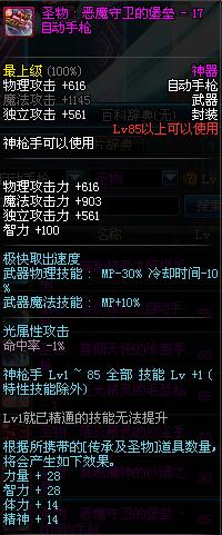 | 85 | 圣物 : 恶魔守卫的堡垒 -×17自动手枪 | *Lv85~91普通地下城怪物掉落 | ||