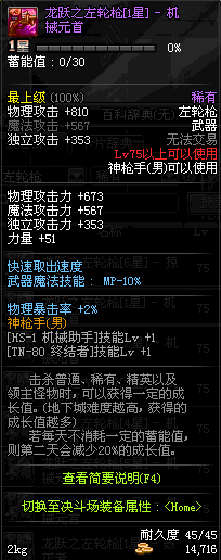 | 75 | 龙跃之左轮枪[4星] – 毁灭者 | *完成二次觉醒任务后可以从NPC小铁柱处获得此道具。 | ||